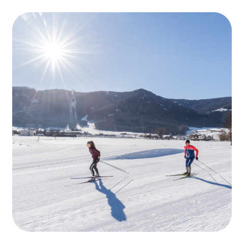 Wenn die Temperaturen fallen und die Natur sich in ein glitzerndes Kleid hüllt, locken die Dolomiten und die Naturparks mit unberührten Tiefschnee-Hängen, ideal für Skitouren. Die winterliche Stille ist auch beim Winterwandern ein Genuss – mit oder ohne Schneeschuhe. Besonders empfehlenswert ist der Pragser Wildsee, der im Winter eine ganz besondere Schönheit offenbart. Wenn Sie lieber vor Ort bleiben wollen, dann schauen Sie bei unserem Teich vorbei, der sich in eine märchenhafte Eisfläche verwandelt hat. Wenn das Eis dick genug ist (fragen Sie uns), dürfen Sie gern einige Runden mit den Schlittschuhen drehen.
