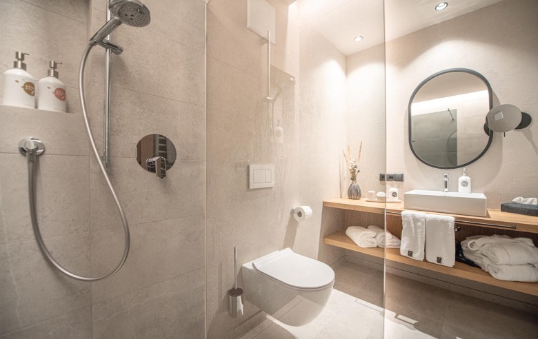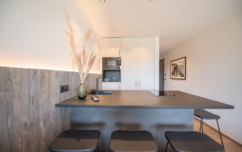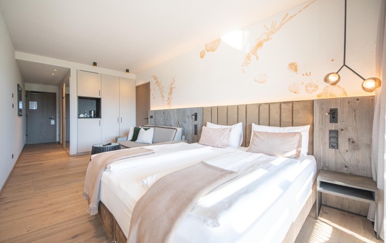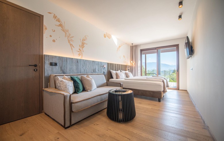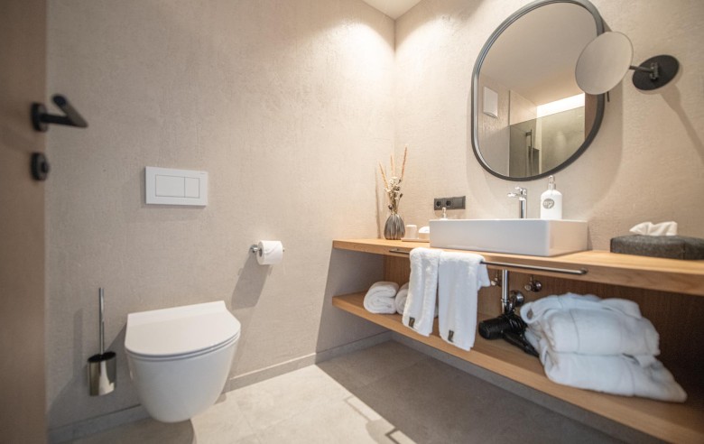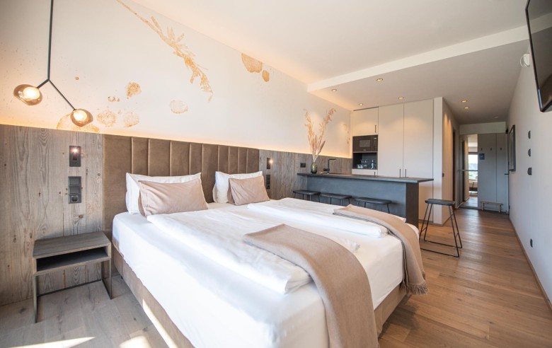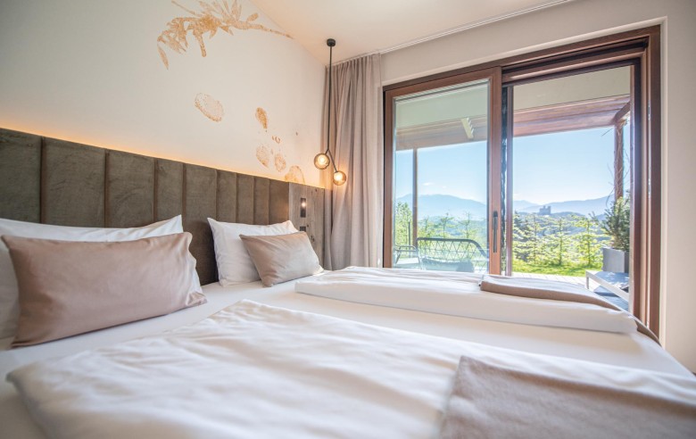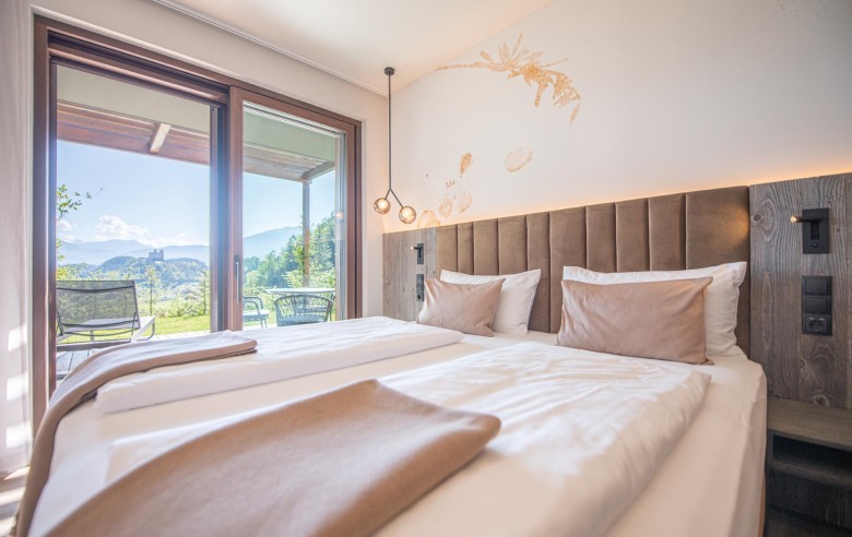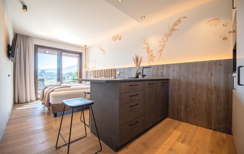 Gli appartamenti, ispirati allo stile Bio-Hotel, combinano eleganza sobria e calore naturale: legno antico, delicati accenti pastello e ampie vetrate creano un rifugio che sembra fondersi con il paesaggio circostante.
